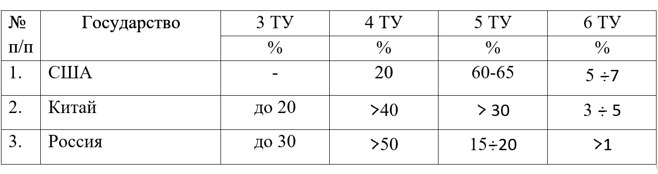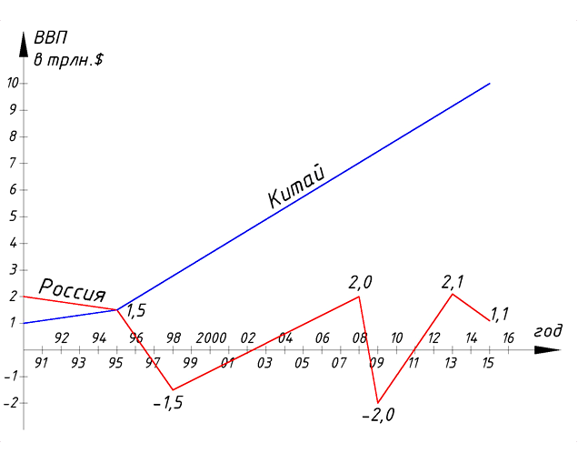 Из таблицы видно, что Россия находится в самом худшем положении и выйти из него очень сложно и трудно, т.к. всего лишь 1% доли 6-го ТУ стоит целого годового бюджета нашей страны и даже больше, и это зависит от того: как считать деньги; на что тратить; и какая ресурсная база в условиях финансово-экономических санкций, плюс временной фактор. США свои проценты получили за 10 лет, а КНР – за 5 лет! И они (Китай) при этом резко снижают доли 3 и 4-го ТУ и перескакивают, когда нужно, через 5-ый ТУ. И это у них стратегический план и они его успешно выполняют, поражая мир! У США сейчас наметилось серьёзное отставание в темпах этого перехода, а у нас вообще ни какого плана нет. Статистика – вещь упрямая, и если её правильно подать, то многое становится понятно. Вот я и привожу таблицу с цифрами и графиком уровней ВВП России и Китая, чтобы стало ясно, какая модель развития лучше, т.к. мы до сих пор не достигли уровня ВВП в 1990 году =2.5 трлн.$.